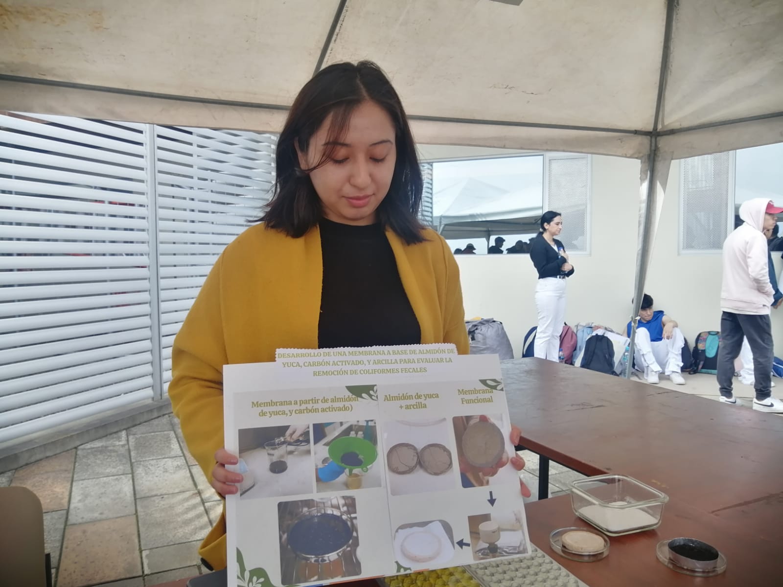 La estudiante Daniel Bravo explicó el proceso de purificación de agua a partir de una membrana de almidón de yuca, carbón activado y arcilla. La membrana sirve como un filtro para retener los contaminantes y dar paso a la purificación.